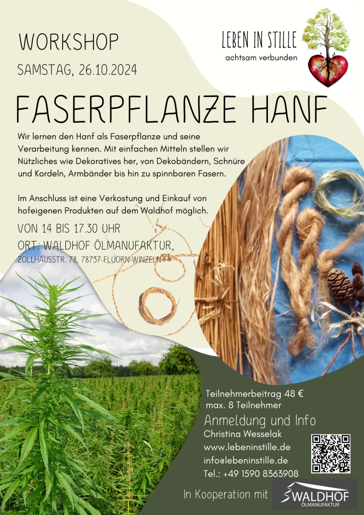 Hanf ist eine sehr alte und vielseitige Nutzpflanze. Während auf dem Waldhof Hanf zur Ölgewinnung angebaut wird, nähern wir uns in diesem Workshop dem Aspekt der Fasergewinnung.